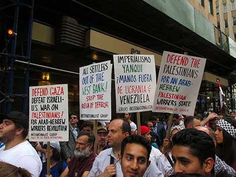 photo) The protests have been dominated by Palestinian nationalism and Islamic appeals, which is to be expected in the face of Israel’s theft of Palestinian lands and more than six decades of violent suppression of the subjugated Arab population’s national and other democratic rights. The Internationalist Group and League for the Fourth International have repeatedly demonstrated to “Defend Gaza” and “Defend the Palestinian people” on a program of proletarian internationalism, calling for an Arab-Hebrew Palestinian workers state in a socialist federation of the Near East. We have pushed for workers action against Israel’s war on the Palestinians, and called to “smash imperialism and Zionism through workers revolution.”