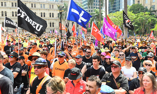 Thousands of members of the Construction, Forestry, and Maritime Union (CFMEU) took to the streets to protest government takeover of union division. Above: Brisbane, 27 August 2024. (Photo: Jono Searle / AAP)