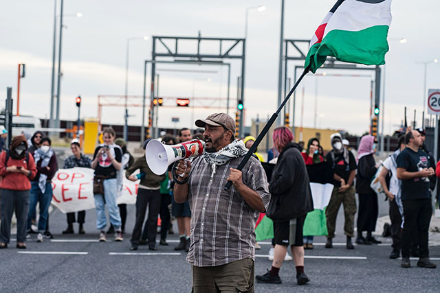 Mobilize labor’s power to stop war cargo to Israel. Above: protest blocks loading of Israeli ZIM Line ship at port of Melbourne, 18 January 2024. (Photo: Matt Hrkac / Middle East Eye )