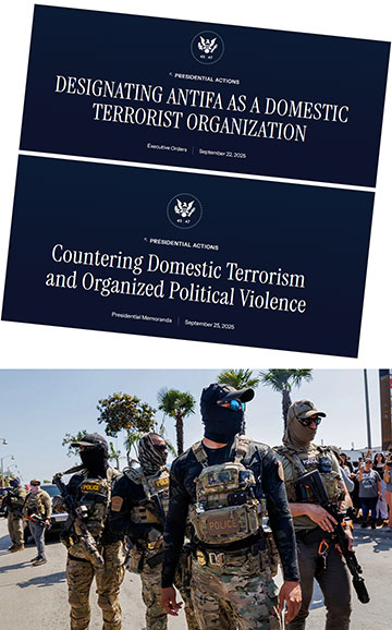 Above: Trump executive order of September 22 and National Security Presidential Memorandum of September 25 slander leftists. Below: Masked federal terrorists during June 20 raid on car wash in Bell, CA, threaten the local population.