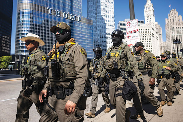 Border Patrol marches in military formation through downtown Chicago on September 28.