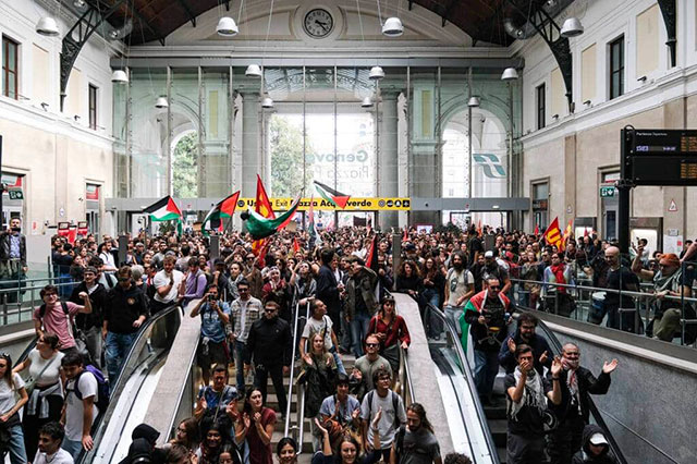 The power of labor mobilized: demonstrators occupy rail station in Genova, Italy during October 3 mass strike in solidarity with the Palestinian people of Gaza. The fascist-led far-right government had issued a decree-law outlawing blocking railways, highways, ports and picketing in the streets. With more than 2 million in the streets protesters did all that, turning the draconian police-state decree into a dead letter, for now.