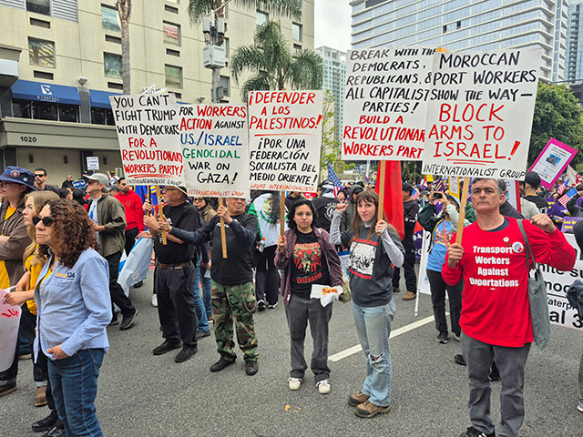 Internationalist Group at a May Day 2025 march in Los Angeles, calling for international workers action against the U.S./Israel genocidal war on Gaza. (Internationalist photo)