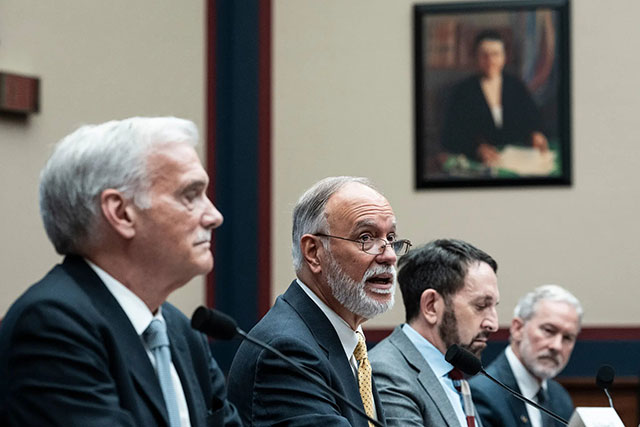Chancellor Félix Matos Rodríguez of the City University of New York (second from left) testifies at House Committee on Education hearing, 15 July 2025, flanked by Georgetown’s Robert Groves and Rich Lyons of UC Berkeley. McCarthyite spectacle evoked 1950s “Un-American Activities” inquisition.