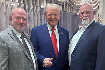 Harold and Dennis Daggett meet with Tump at his Mar-a-Lago resort-estate, December 2024. Flattering the “America-first” president whose sky-high tariffs have sharply cut world trade will not save dockworkers’ jobs internationally. (Photo: ILA)