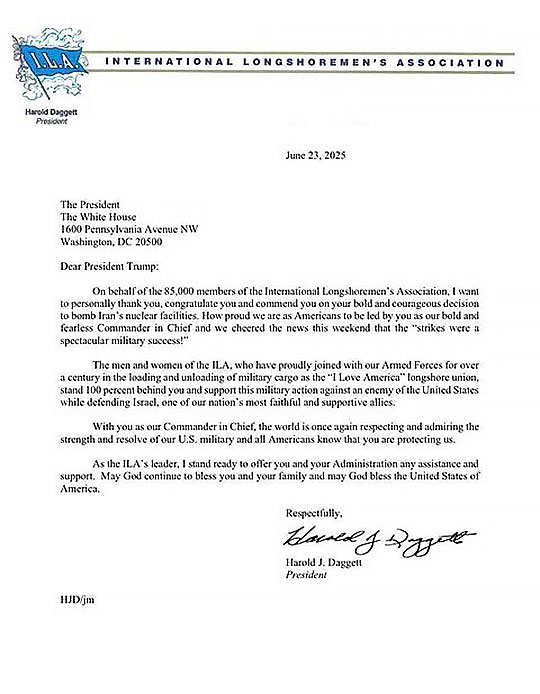 congratulating him on the June 22 bombing of Iran. Click on image to enlarge.On the opening day of the June celebration, with IDC dockworkers leaders from around the world present, Harold Daggett (who did not attend) sent out an explosive letter to Donald Trump that reverberated like a hand grenade amongst the attendees. The ILA president said he wanted to “personally thank you, congratulate you and commend you on your bold and courageous decision to bomb Iran’s nuclear facilities. How proud we are as Americans to be led by you as our fearless Commander in Chief….” The grotesque letter went on: