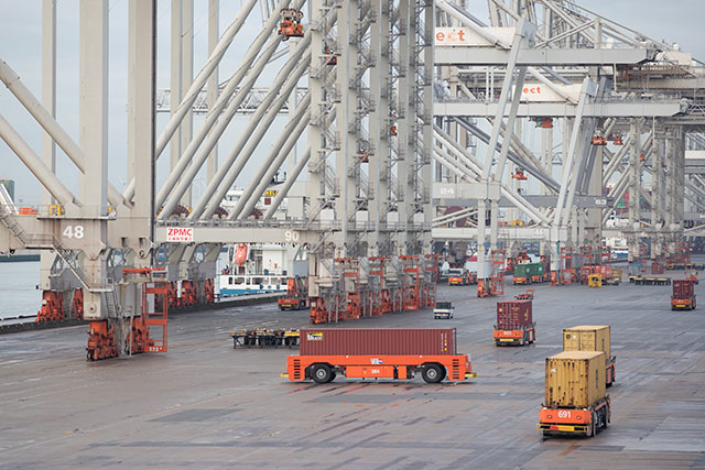 Containers are unloaded from ships by remote-controlled gantry cranes onto driverless vehicles at the Hutchison Delta Terminal in the port of Rotterdam, Netherlands. Containerization and now the push for full port automation have reduced the number of dockworkers in Rotterdam from over 13,000 in the 1950s to less than 3,000 today. Dealing with the threat of job-killing automation is an existential issue for dockers. For union control of technology!
