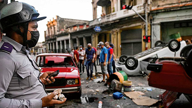 Police cars overturned during anti-government riots on 11 July 2021. (Photo: Yamil Lage / AFP)