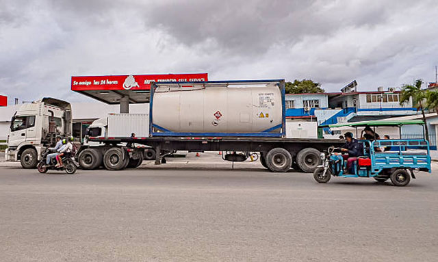 A truck belonging to a private company carrying an ISO tank of imported fuel, parked in front of a gas station in Havana on March 19. (Photo: Adalberto Roque / AFP)